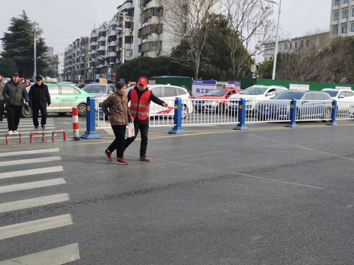 志愿者们身穿红色志愿者马甲,头戴红帽,手持小红旗,在指定活动地点配合交警部门和市容部门对周边交通进行疏导,行人中有遇到老弱病残的,志愿者积极地帮忙推轮椅,搀扶病人,引导车流避让。