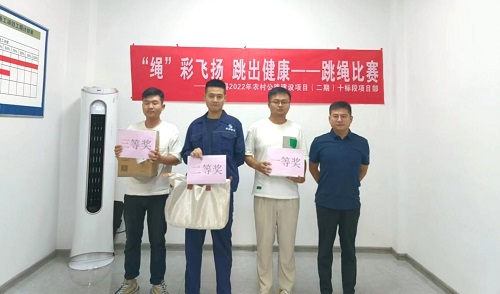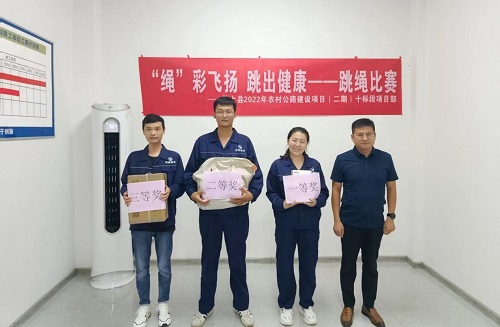 跳绳比赛赛场呈现一派欢腾的景象,绳子在参赛选手的脚下“嗖嗖”的穿过,选手们龙腾虎跃,奋力甩动手中的跳绳,加快双脚的跳跃。最终由项目部叶梦杰、王可可、纵宁分别获得了此次跳绳比赛的一等奖、二等奖、三等奖。两项比赛结束后由项目经理王志强同志为获得胜利的选手发放比赛奖品。
