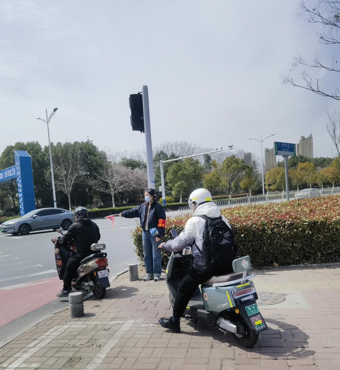在集贤路与明珠大道交叉口红绿灯旁,运维分公司党员及职工手持劝导小红旗,在路口引导来往车辆行人遵守交通规则,有序进出,用实际行动引导群众坚决摒弃不文明交通陋习,增强自身交通安全意识和自我防范意识,严格遵守交通法规,做文明交通的践行者。