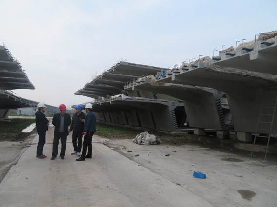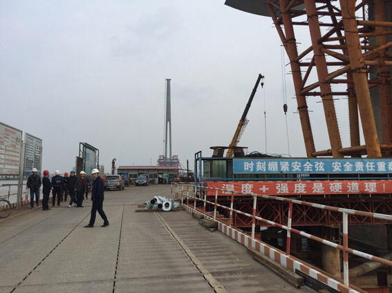 在芜湖长江二桥总监和中铁大桥局项目经理的带领解说下,我们先后参观了预制场、引桥及主塔的施工现场。我公司刘经理与芜湖长江二桥项目经理探讨了预制场建设及施工过程中管理经验;工程安全科则与项目部技术负责人对施工技术进行了深入的交流。