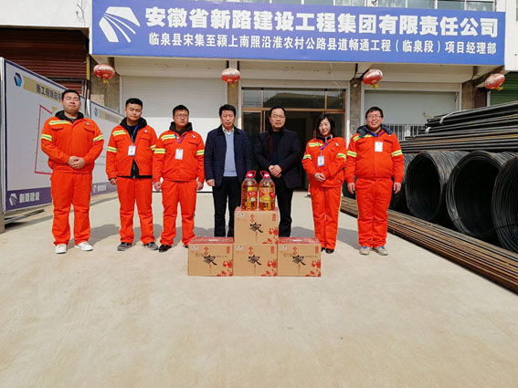 新春佳节之际,为感谢这一年来奋战在施工一线的员工们的辛勤付出,于2月12日,由安鑫公司党支部书记崔传志同志带队,安鑫公司刘宏伟经理、王奎民副经理陪同,对临泉沿淮公路项目部及泗许、滁新高速公路小修保养工程项目部进行春节慰问活动。