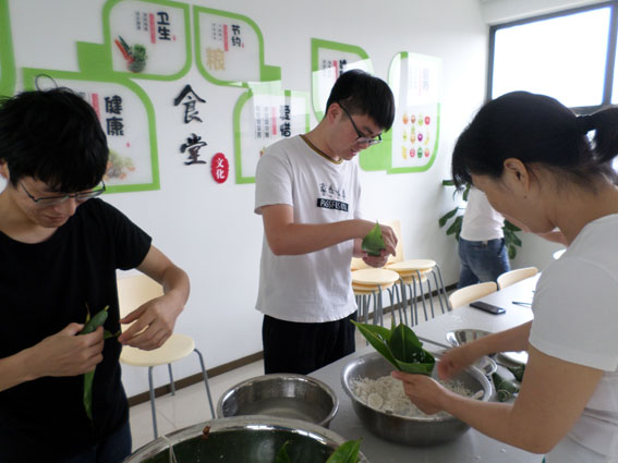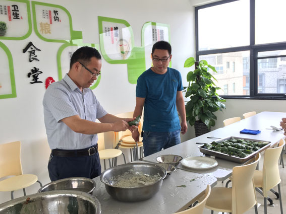 本次活动在员工食堂开展,食堂工作人员精心准备了蜜枣、粽叶、绳等材料。活动一开始,全体职工就迅速围在一起,相互交流、比划,忙得不亦乐乎,三角形、长条形……各式各样的粽子陆陆续续诞生了。集团公司崔总忙中抽闲来到员工食堂进行了参观指导,只见崔总动作娴熟地拿起粽叶卷成漏斗状,填米、压紧、扎绳、一气呵成。