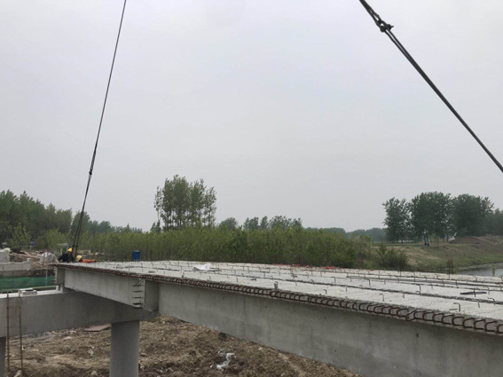 2019年4月15日上午,我项目部进行了赵桥桥梁吊装工作。我项目部在吊装施工前对吊车操作及施工班组全体人员进行了安全技术交底,并安排项目安全人员进行施工现场交通疏导,确保梁板运输与吊装作业安全顺利进行。随着各项准备性工作的有序进行,阜南危桥项目部第一片梁板吊装顺利就位。