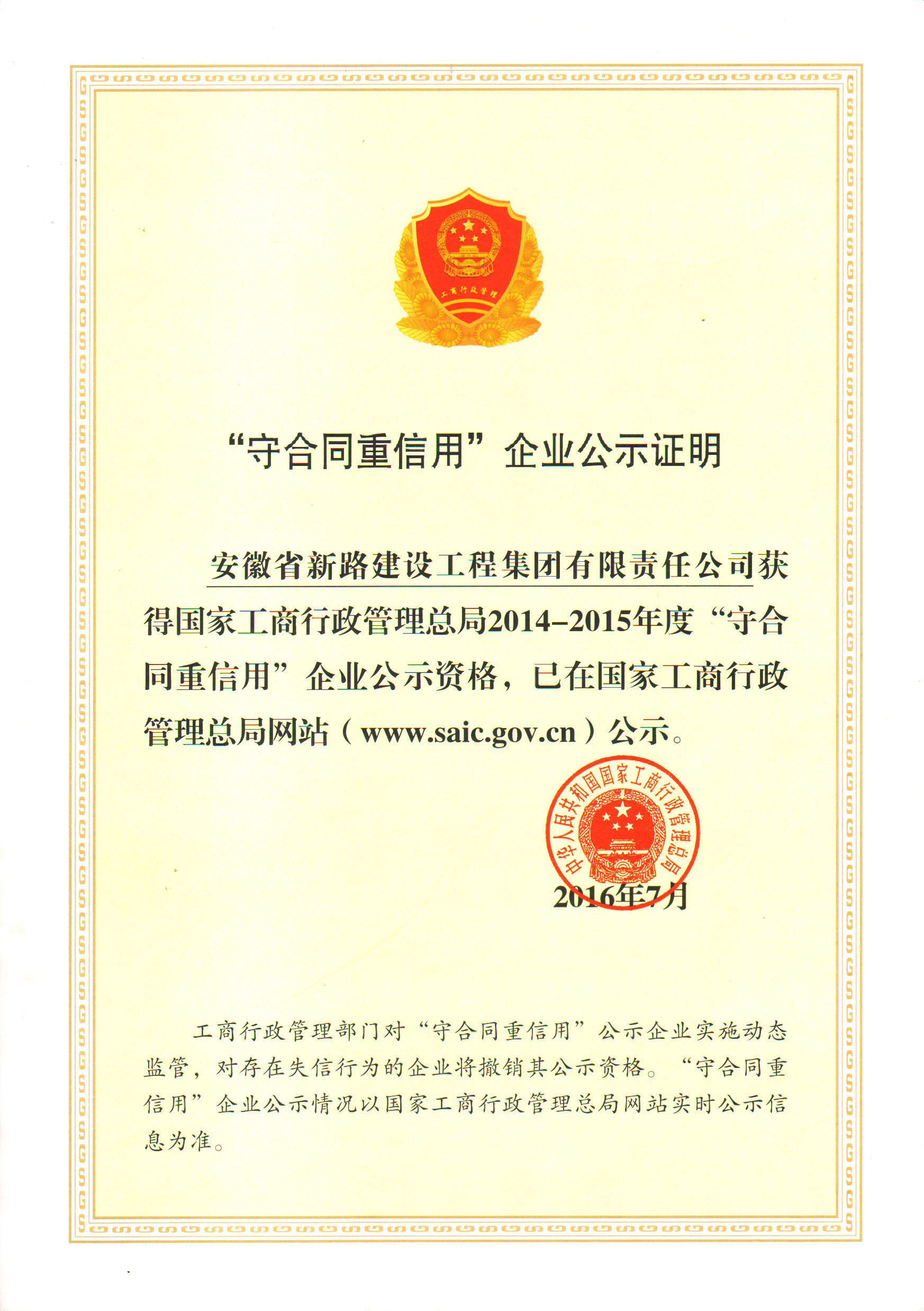 国家级守合同重信用证书