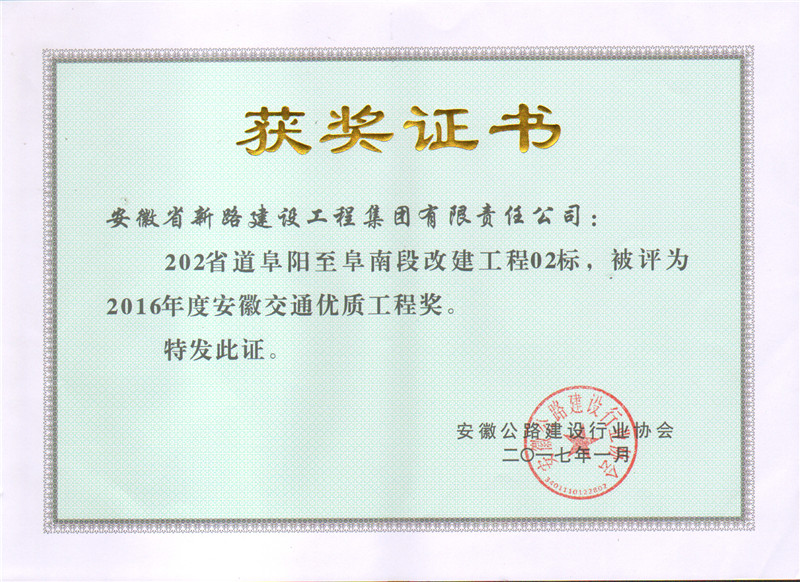 S202阜阳至阜南段省优质工程奖