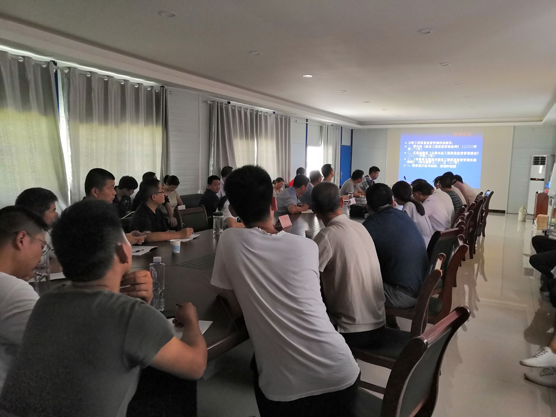 质监局杜存宝科长首先对项目的施工、监理、中心试验室的主要人员履约情况进行了考核,现场通报了考核结果,针对工程项目情况和特点,杜科长对相关单位通报了监督组织体系,包括监督组织机构、监督职责、监督检查组织方式。同时对监督工作重点进行了交底,包括参建单位管理行为督查重点、各专业工程施工工艺和实体督查重点。