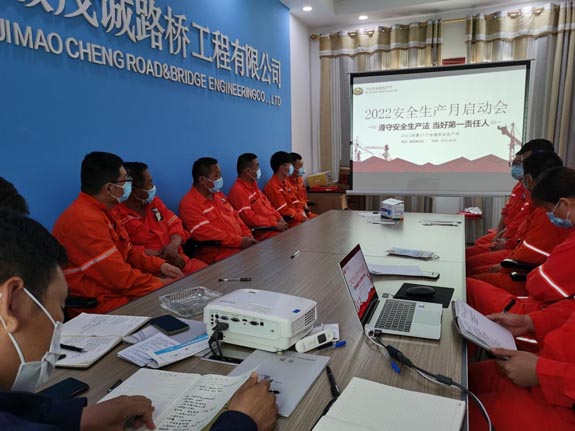 2022年6月2日上午,插花拌合站围绕《遵守安全生产法,当好第一责任人》主题召开2022年“安全生产月”活动启动会,拌合站站长韦志明宣布活动正式启动并讲话,会议由机长陈理想、安全员李智鹏主持。