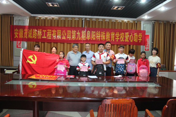 扶贫济困是中华民族传统美德,友善互助是新时期的社会主义核心价值观。2019年9月11日,安徽茂诚路桥公司经理尹飞、副经理张炜等人再赴阜阳市特殊教育学校,继续帮扶这些聋哑、失明、智障、自闭的特殊儿童,为他们送去了爱心助学金及学习用品。