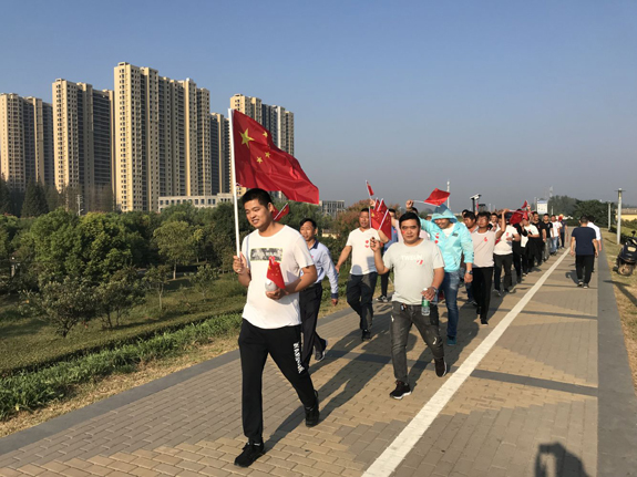 正值中华人民共和国成立70周年,参加徒步人员手持小红旗,身贴红旗贴纸,热烈庆祝国庆,祝福祖国母亲永远昌盛繁荣。