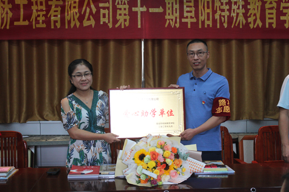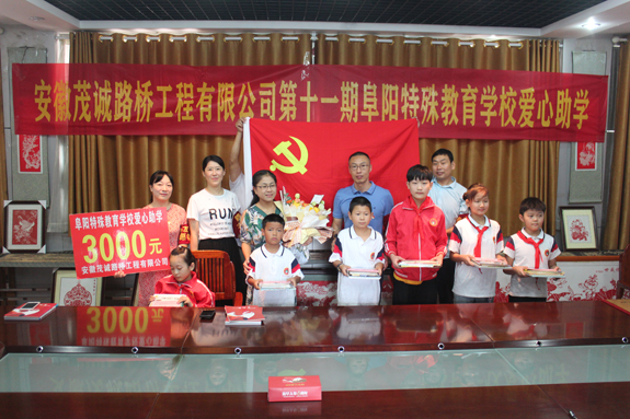 为践行社会主义核心价值观,履行社会责任,彰显企业担当。2020年9月9日上午,安徽茂诚路桥工程有限公司经理尹飞带队再赴阜阳市特殊教育学校,继续帮扶这些聋哑、智障、自闭的特殊儿童,为他们送去了爱心助学金及学习书籍。