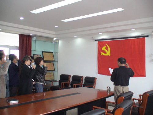 “我志愿加入中国共产党,拥护党的纲领,………”“严格禁止利用职务上的便利为请托人谋取利益,………”2008年9月28日下午,阜阳市公路工程有限责任公司会议室传出响亮的声音,二十余名公司党员领导干部面对党旗庄严宣誓。