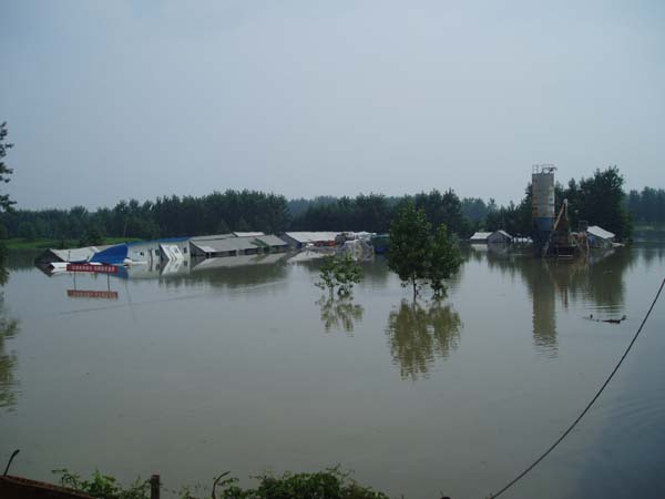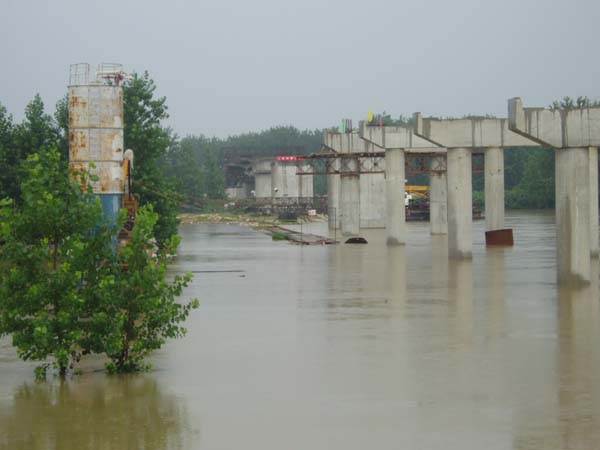 6月底以来雨水开始肆虐颍上县,洪灾给刘颍河大桥项目带来很大影响和损害。由于颍上县地势低洼,高程普遍在25.0米左右,地方上形象地称为“锅底”。至7月5日,雨水把颍河坝内外工地施工现场、料场、职工宿舍、仓库、食堂等全部淹没,项目部办公室、便桥冲垮、电力设施中断,预制场处内涝水深达1米以上,工程被迫停工。由于项目部房屋被冲垮,临时办公室迁到附近的村办事处。