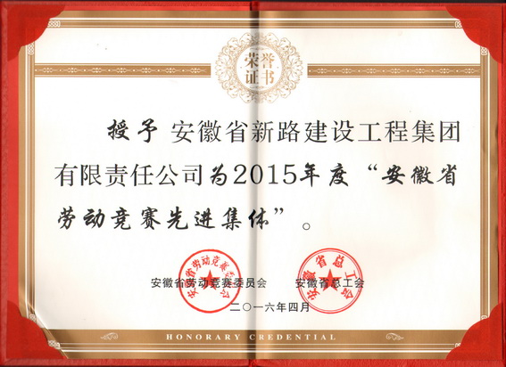 近日,我集团公司荣获由安徽省劳动竞赛委员会和安徽省总工会颁发的2015年度“安徽省劳动竞赛先进集体”荣誉称号。