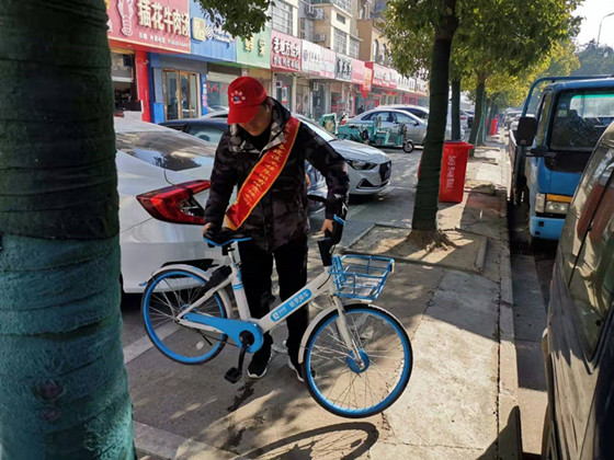 志愿者把共享单车放在指定位置