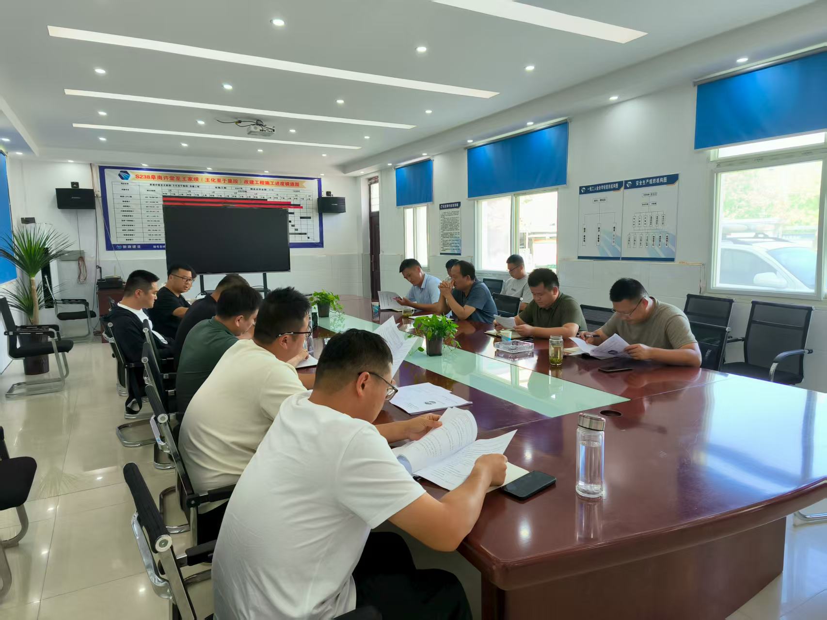 为切实推进S238阜南许堂至王家坝(王化至于集段)改建工程建设进度,及时解决施工过程中存在的问题,确保项目按期保质完成,近日,阜南县公路管理中心陈华主任、项目监理办总监代表郭瑞、中心试验室主任李昊一行赴S238阜南许堂至王家坝(王化至于集段)改建工程项目部开展工程项目推进会。项目部经理张茂坤及项目核心管理团队成员全程参会。