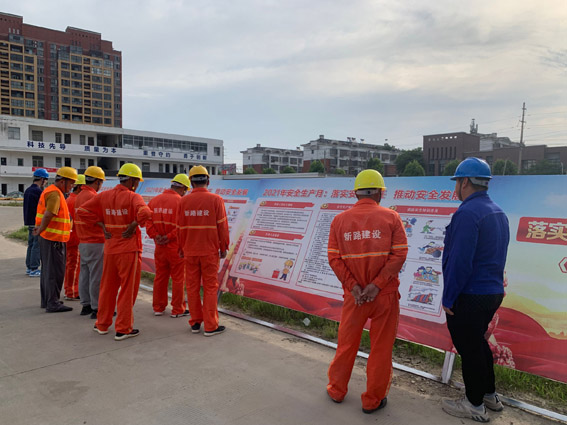 阜南县“四好农村路”项目组织一线施工人员对“安全月”展板内容进行学习