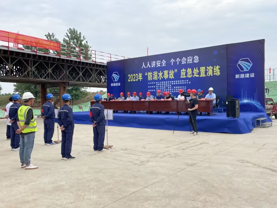 S428(原S420)颍上杨湖至赛涧颍河大桥及接线工程项目部于2023年6月16日下午15:00时,在南岸钢栈桥施工现场组织开展了“防溺水事故应急处置演练”,项目部管理人员、监理人员及颍上县海事(港航)管理服务中心联合一线作业人员共同参加演练。邀请市交通执法支队、颍上县水利局、颍上淮河河道管理局、刘集乡人民政府、赛涧回族乡人民政府进行观摩,颍上县应急管理局、颍上县交通局和颍上交投能源投资建设集团有限公司等领导对本次防溺水事故应急处置演练进行了高度评价。