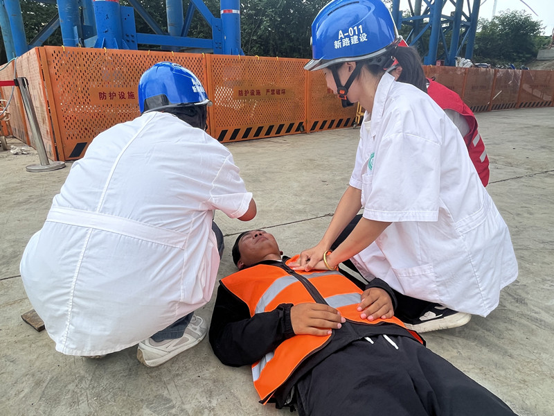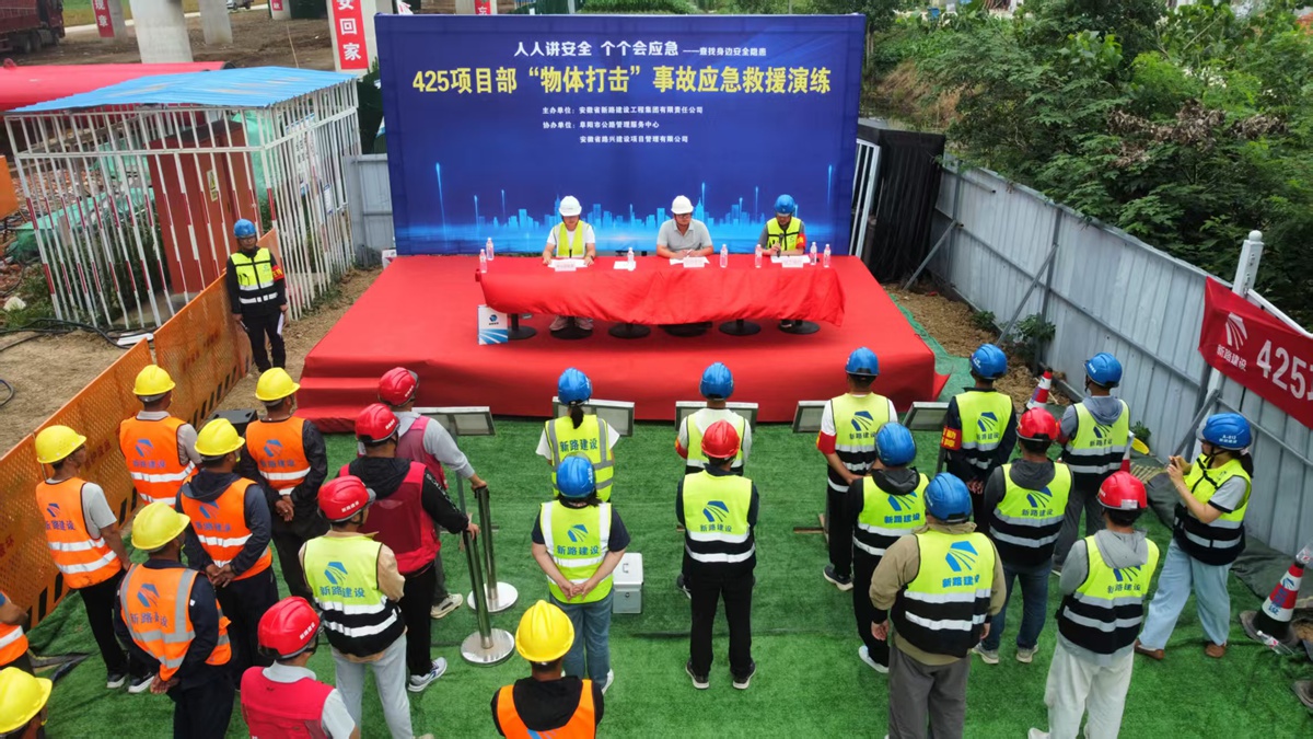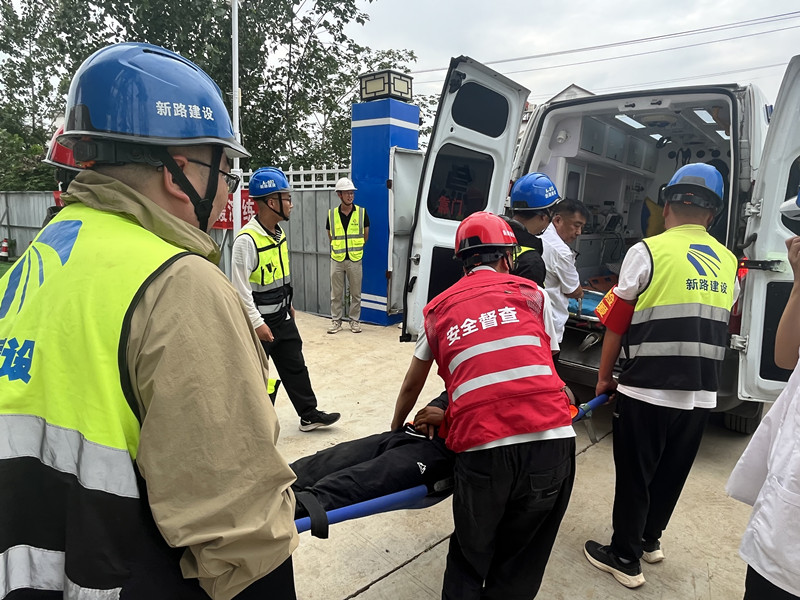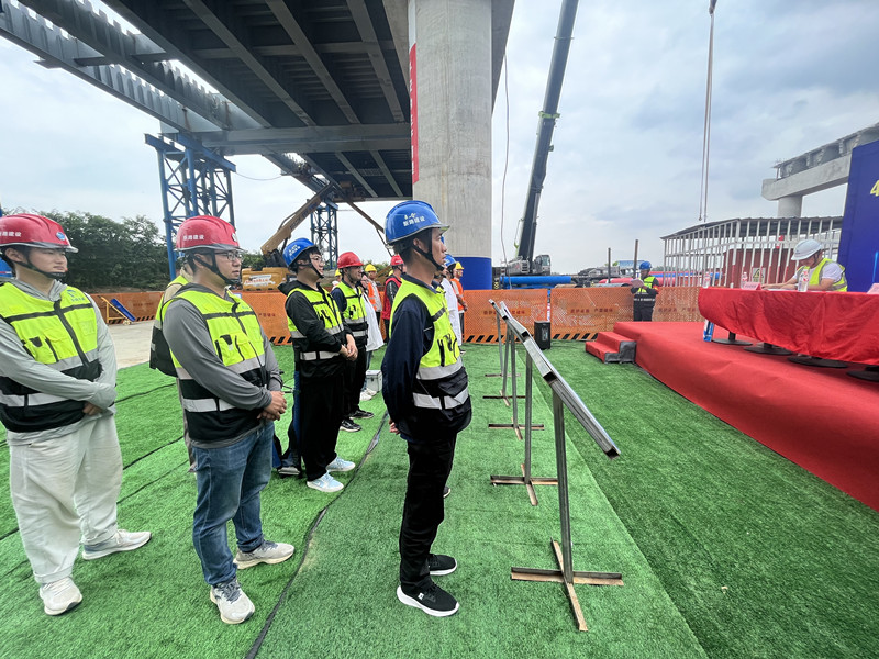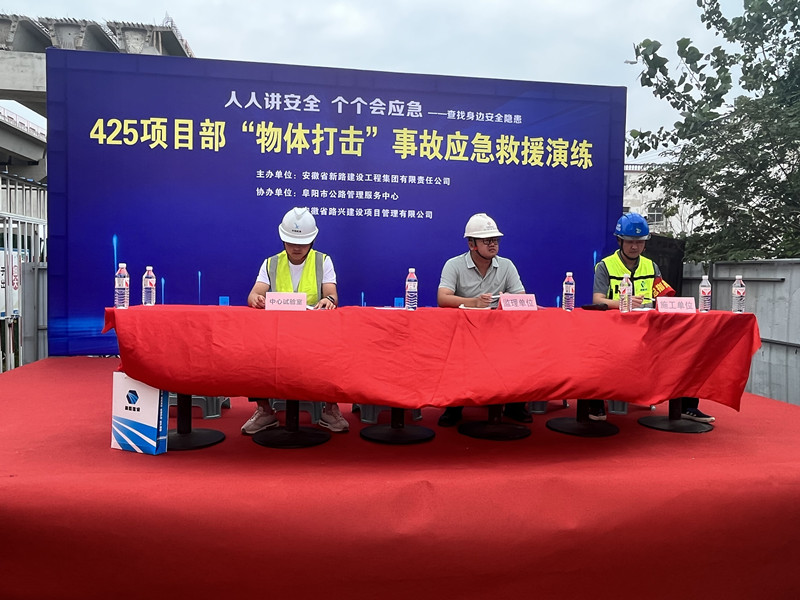 2025 年 6 月 25 日, 425(原 423)省道颍河至六十里铺段工程项目部在 K2+433 大桥钢桁架施工现场开展物体打击应急演练活动,旨在提高项目部应对突发事故的能力,增强员工的安全意识和应急处置技能。活动特邀监理单位及第三方检测单位领导共同参加。