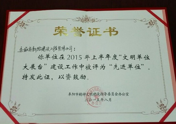 集团公司自取得安徽省第十届文明单位以来,积极开展道德讲堂、企业文化、文明传播等活动,并严格按照安徽省“文明单位大展台”信息、图片、视频等上传要求及时上传活动信息,在阜阳市上半年文明创建工作评比中,荣获“文明单位大展台”先进单位称号。