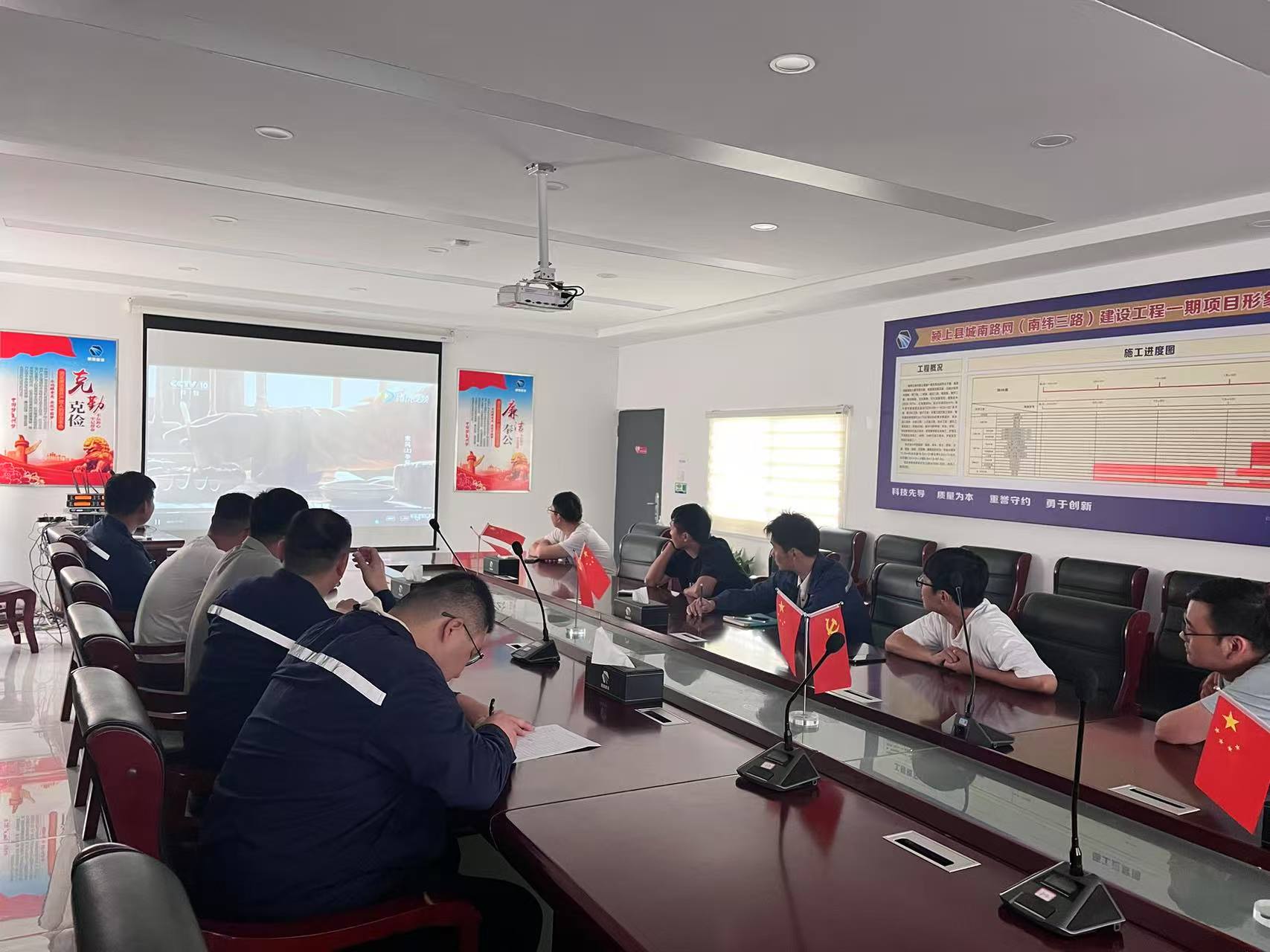 2025年7月31日中午12:20,颍上县项目部在会议室举行爱国主题教育观影活动。爱国主题教育纪录片《山河岁月》以广阔的视角、精致的表达深情回望革命英烈的坚定理想与热血真情,再现风云岁月中的典型人物与关键时刻。先辈们不屈不挠、勇于斗争的精神深深触动了在场的每一个人。