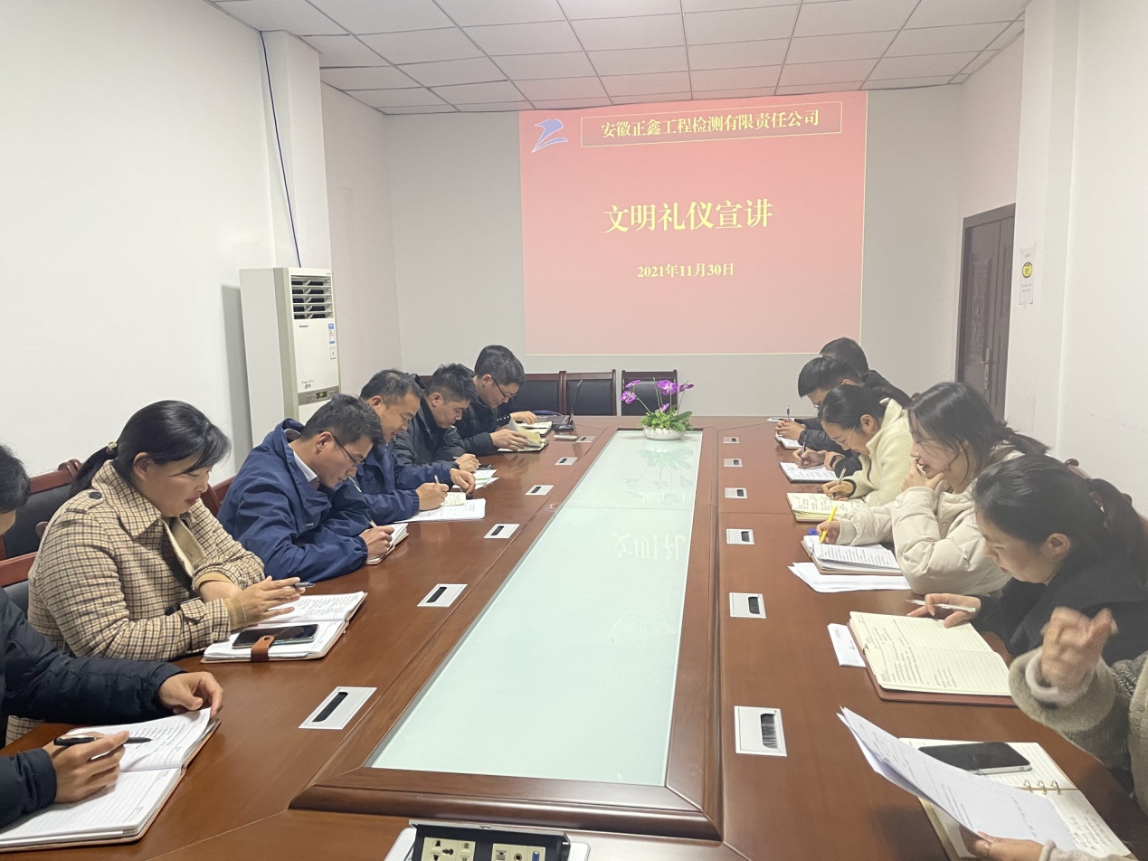 文明礼仪是社会和谐发展的根基,也是我们健康成长的臂膀。为提高公司全体员工的素养与规范大家的文明礼仪,正鑫检测公司在11月30号下午开展《文明礼仪》学习培训。