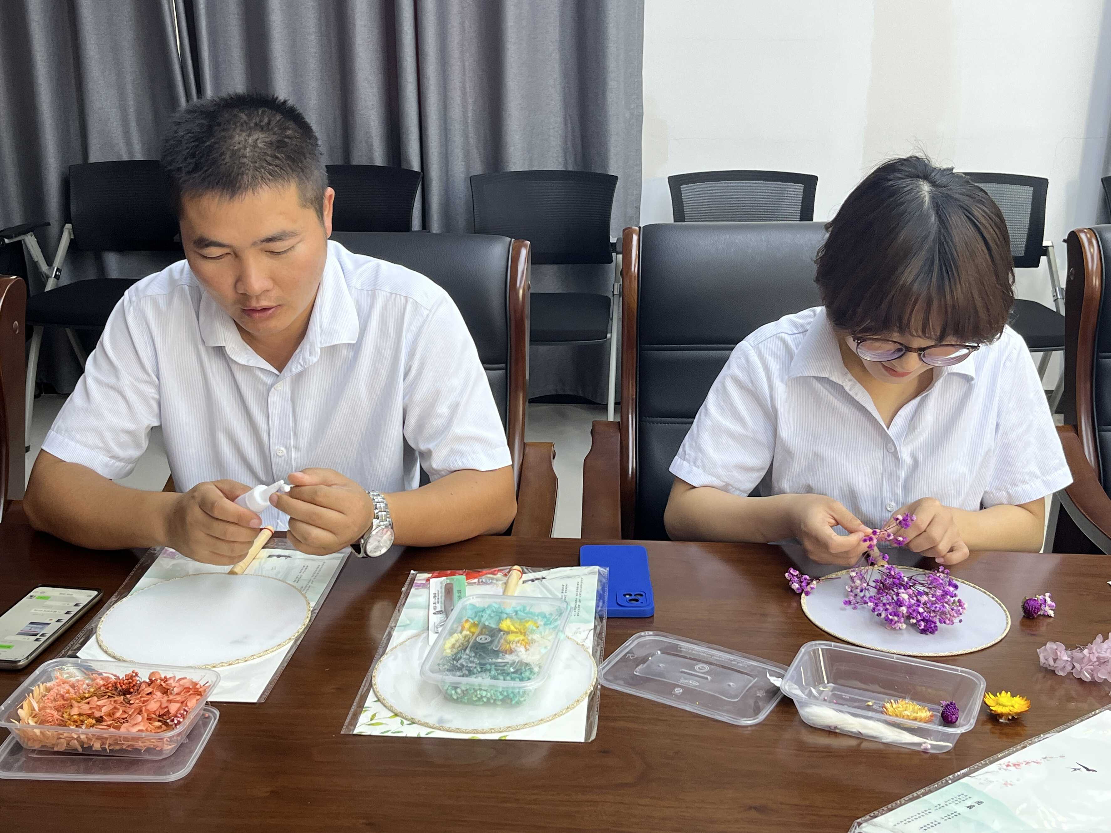 团扇是古代扇文化的代表,有着深厚的文化底蕴,因其形似一轮明月,象征着团圆美好的吉祥寓意。活动开始了,现场每个人都积极动手制作,先用干花在团扇上摆出自己想要的图案,随后用胶水固定干花,经过近一个小时的制作,一幅幅清新淡雅或者色彩艳丽的团扇作品呈现在大家眼前,它们或“锦绣”、或“婉约”、或“柔情”,将中秋的美好祝福和心愿都凝聚于一把小小的团扇中。