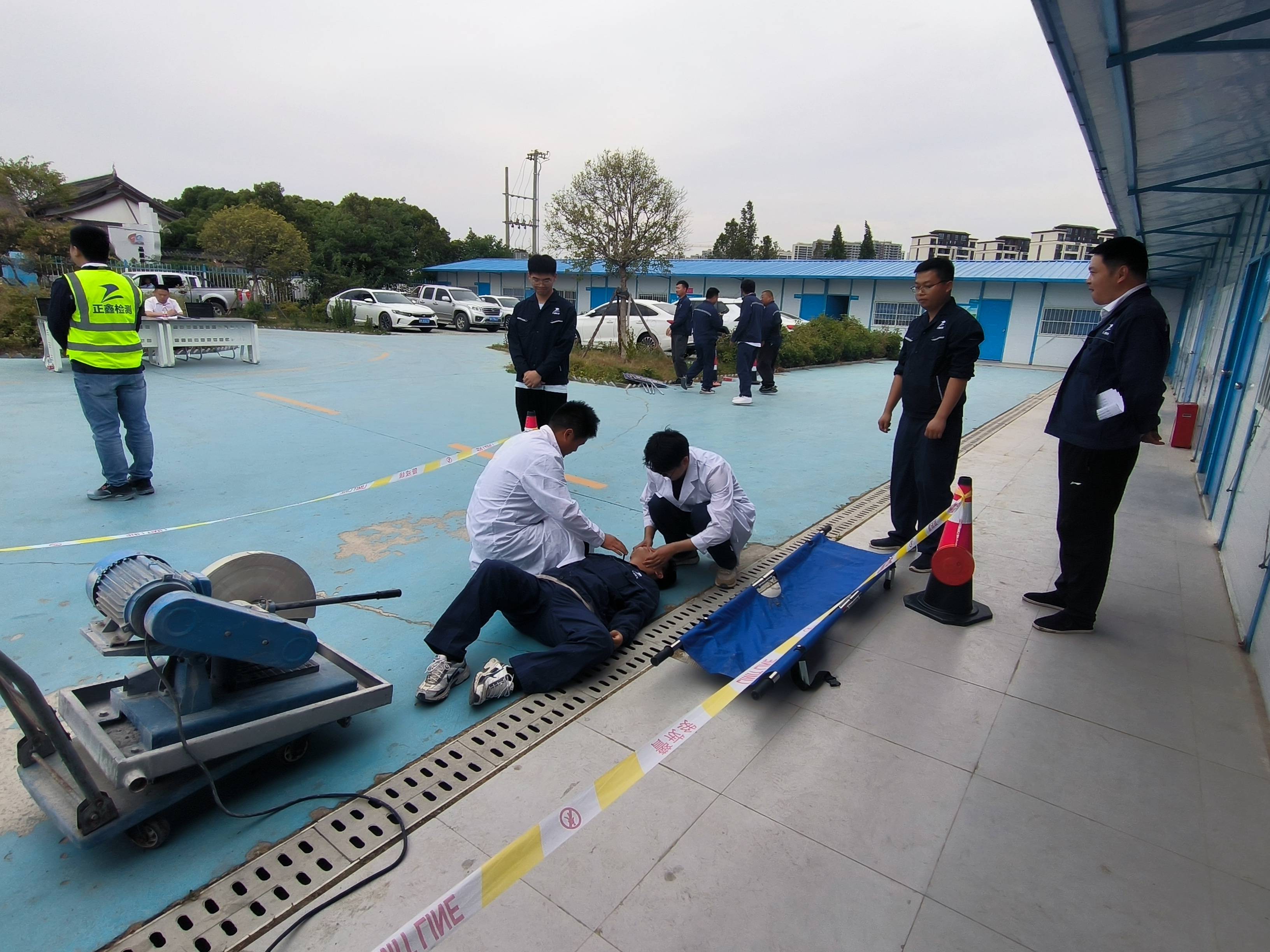 本次演练的场景是安徽正鑫工程检测有限责任公司徐州至淮北至阜阳高速公路阜阳段工程施工项目02标段工地试验室人员正在开展检测工作,因芯样切割机电源线老化绝缘皮破裂导致仪器带电,员工触电致使昏迷。演练主要包括事故模拟、受伤人员救治、现场安全警戒等步骤。公司经理王思伟宣布演练开始后,根据副组长张曼的指令,各小组立即进入指定位置,按照演练方案展示出各自不同的既定动作,整个演练过程顺利进行。