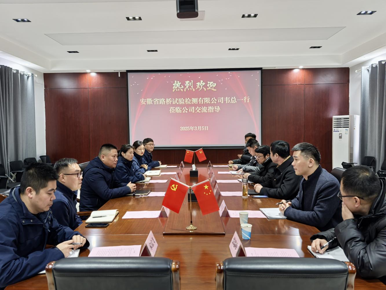 为加强行业技术互通,推动检测服务高质量发展,2025年3月5日上午,安徽省路桥试验检测有限公司党总支书记、总经理韦海涛率技术团队一行6人莅临公司开展业务交流活动。公司党支部书记、总经理王思伟及相关部门负责人出席交流会。